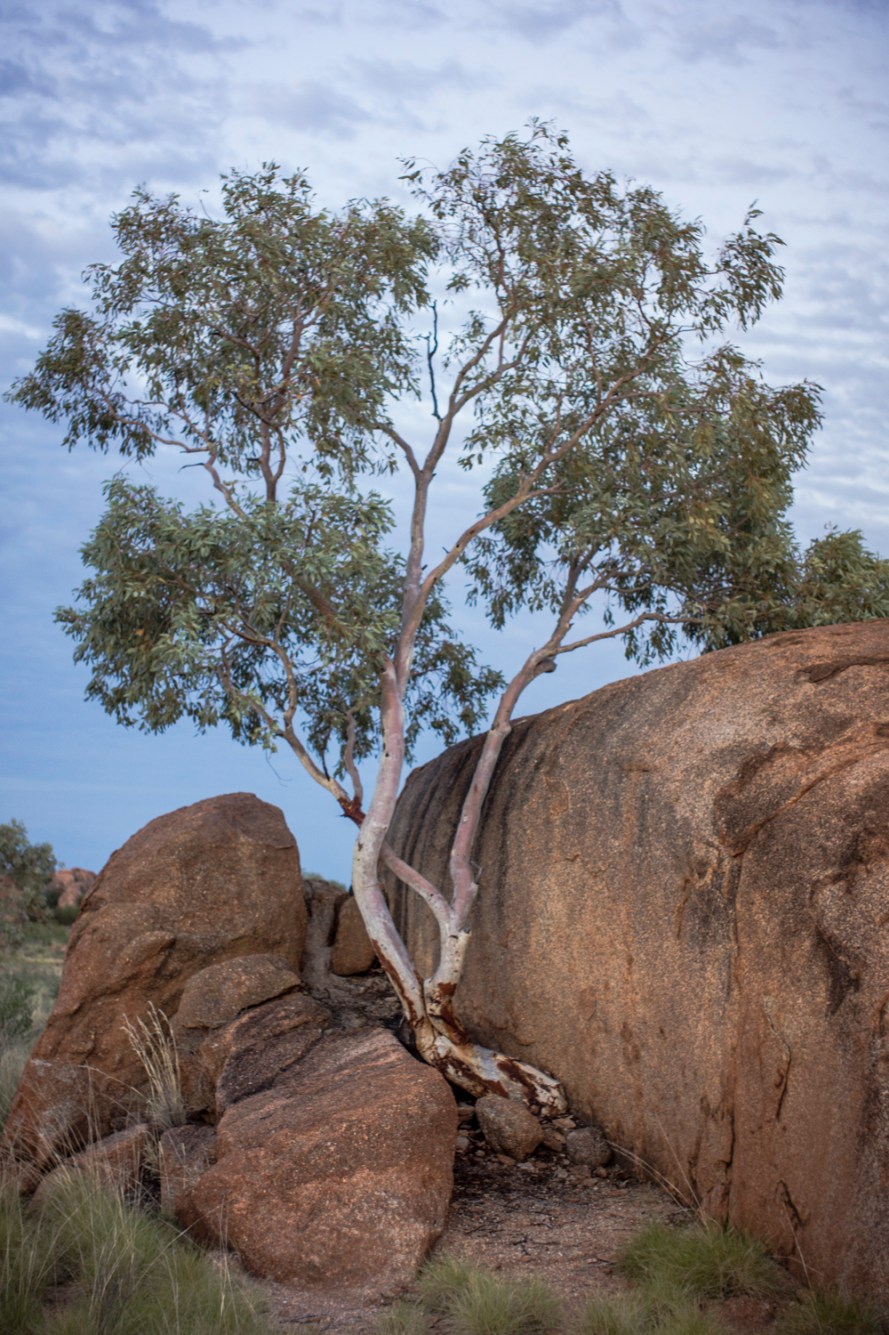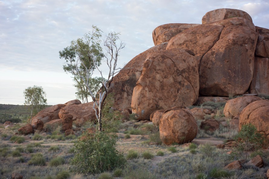 On the return trip once we had linked up to the Stuart Highway via the Buntine and Buchanan Highways we moved quickly south trying to make up for extra time in taking the northern route from Lajamanu. Our aim was get beyond Tennant Creek so that we could camp overnight in our swags at Karlu Karlu, a series of round boulders, which have formed from an enormous chunk of granite, and which are strewn across a large area of a wide, shallow valley.