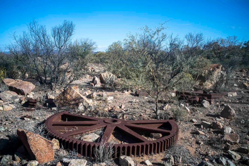 After leaving the creeks we walked across undulating territory with Mt Babbage on our right. We passed the ruins of a well (Harrison’s well), a bore (Con’s Bore), a mining site and an abandoned station— Mt Fitting Station. We were skirting around Terrapinna Gorge which Hamilton Creek runs through because the camels could not walk along the gorge’s very stony ground.