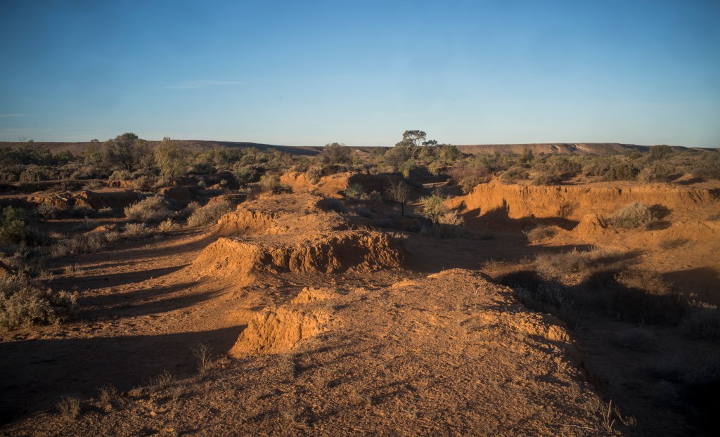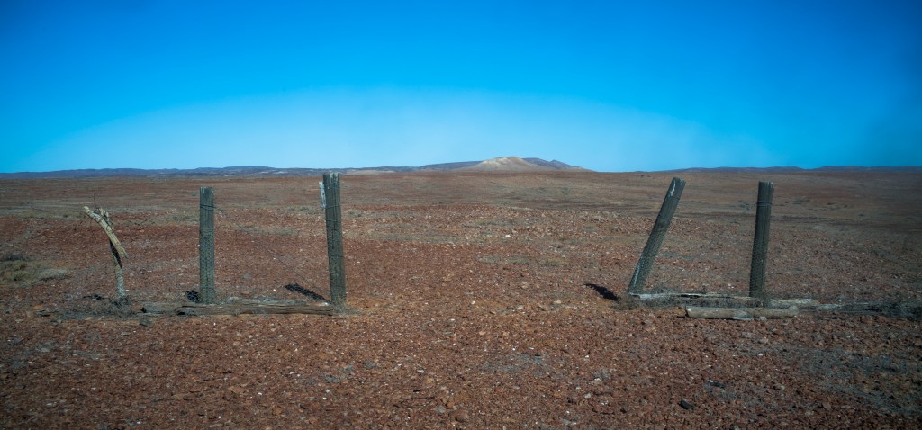As we made our way across a gibber plain the historical ruins of the old dog or dingo fence, which runs east west across South Australia, gave us an insight into the cause of this damaged land — pastoralism. The dog fence was initially build as a rabbit proof fence in the 1880s and then converted to a dog barrier in 1948 to protect the pastoralist’s sheep flocks. As we continued heading north past the fence we entered into an area inhabited by dingoes, where sheep grazing has been abandoned, and where cattle are run. This was the southern part of the historical territory of the Diyari people, who saw/viewed/observed the landscape quite differently to that of the European setters.