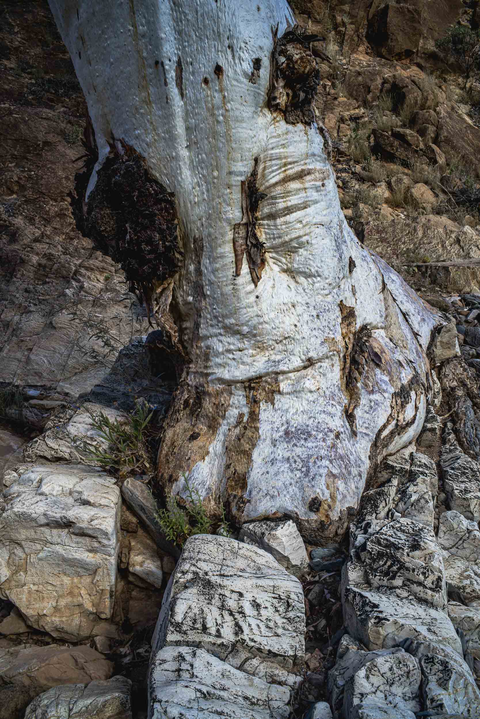 There was no water in Kingsmill Creek as we walked downstream past the the Sturt Desert Pea on the side of the boulder-strewn creek, the red river gums and over a mix of colourful and heavily marked stones and rocks. The bright yellow-brown and iron rich boulders stood out. They looked old and seemed to indicate the presence of the Paralana fault.